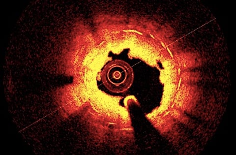 The OCT probe emits an infrared light to generate a high-resolution image. The technique was first developed for ophthalmology, and quickly adapted for interventional cardiology. It magnifies the image produced without losing detail. “It is like an electron microscope inside the blood vessel,” says Dr. Sengottuvelu.