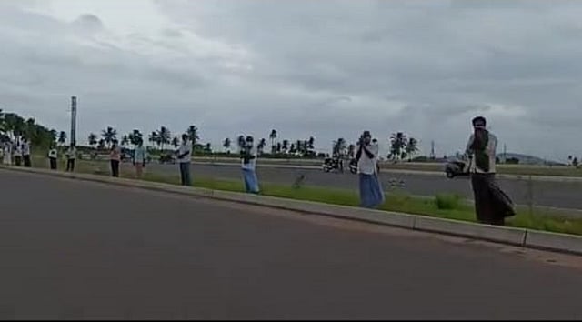 Protesters from various villages formed a human chain along the road, while maintaining physical distance. Some of them were carrying national flags. Few of the protesters were on their knees and with folded hands as the convoys of the judges passed.