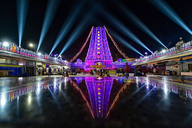 The temple has been decked up in preparation for the celebrations.