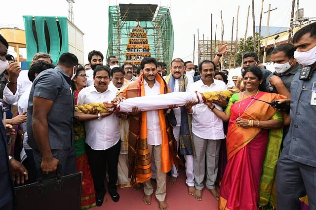 Nearly five months since the Antarvedi temple chariot was gutted in a fire, Andhra Pradesh Chief Minister YS Jagan Mohan Reddy on Friday inaugurated the new chariot of the Lakshminarasimha Swamy temple in East Godavari. CM Jagan performed a puja and pulled the chariot along to formally inaugurate it for the Kalyanotsavam, a ten-day long festival at the temple.