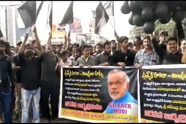 Besides Guntur, protests were carried out in Vijayawada and other cities. Protests were not just restricted to the streets, as #GoBackModi again started trending on Twitter. Along with #GoBackModi another hashtag #GoBackSadistModi also trended in India on Sunday morning.
