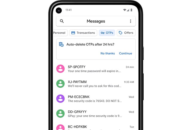Bank transactions and bills will be filtered into the transactions tab, while conversations with saved numbers can be easily located in the personal tab. "All of this happens safely on your device so your conversations stay in the app and you can access your categorized messages offline," the company said. The company is providing the option to automatically delete your one-time passwords (OTPs) 24-hours after they're received.
