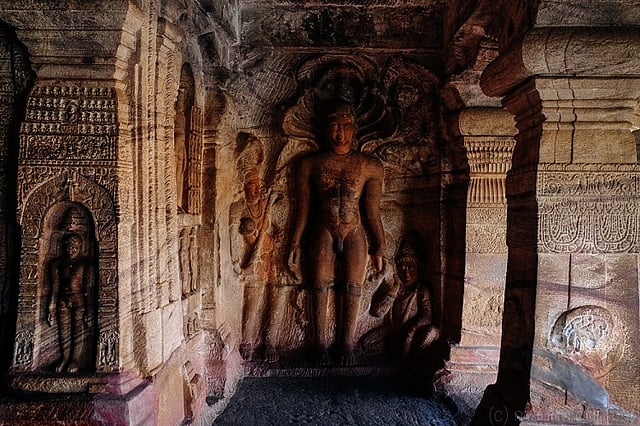 The topmost Jain cave is the newest one, excavated almost a century after the rest. The columns in this cave feature carved Jain tirthankaras. Inside the sanctum, Lord Mahavira is seated in deep meditation. Also depicted are Parshvanatha, the 23rd Tirthankara, and Bahubali, the son of the 1st Tirthankara.