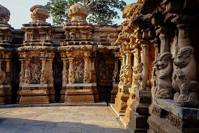 The main shrine is built with a pyramidal vimana, which went on to become typical of Dravidian architecture. Inside, the main deity is a majestic Shivalinga in black granite. The walls around this shrine are covered with exquisite reliefs depicting Shiva in forms like Lingodbhava (Shiva emerging out of a Shivalinga), Urdhava Tandavamurti (performing his cosmic dance), Tripurantaka (the destroyer of three cities ruled by asuras), Harihara (part Vishnu and part Shiva), etc. Lion pillars were a Pallava speciality, and in this temple, they seem to have chosen to go with an absolute profusion of erect lions facing almost all directions.