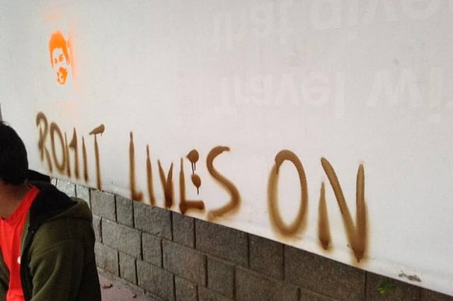 While protests in Town Hall, Freedom Park and individual hunger strikes too have been initiated, on January 29, a Facebook user put up photos of rudimentary graffiti – mostly Rohith’s name and stencil paintings of him – from across Bengaluru.