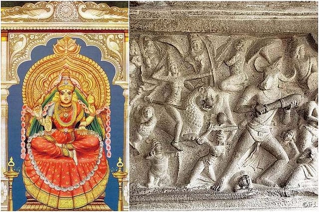 Starting from the famous cave temples of Mahabalipuram constructed during the rule of the Pallava king Narasimha Varman (630-70 AD). Here we see Devi as Mahishasura Mardhini or the slayer of demon Mahisha. This is a common motif of representing the Devi from the Devi Bhagawatam. You can find this in several other heritage sites across the country.