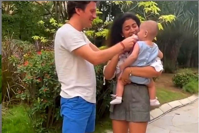 In the video, Shriya can be seen playfully telling her husband that the baby needs water, while Andrei is seemingly drinking water from a sipper. The video has photos of a pregnant Shriya, with Andrei putting one end of a glass container to her belly, and his ear on the other end.