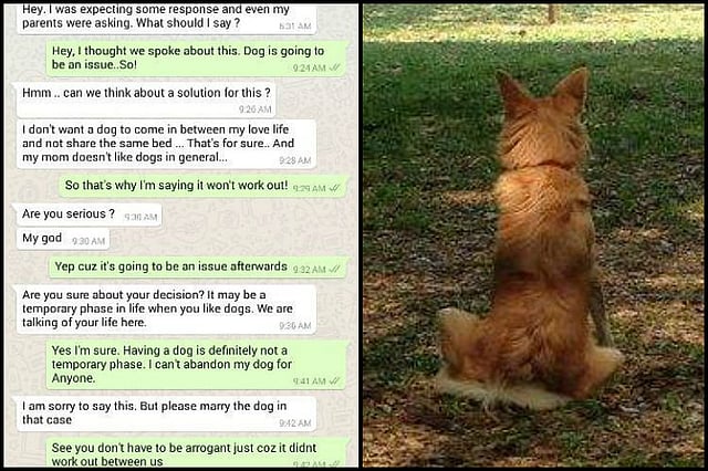 This B'lore girl rejected a guy cuz he doesn't like dogs & wouldn't want one after marriage. U go girl! #TrueStory pic.twitter.com/N4NW6U8IiJ
