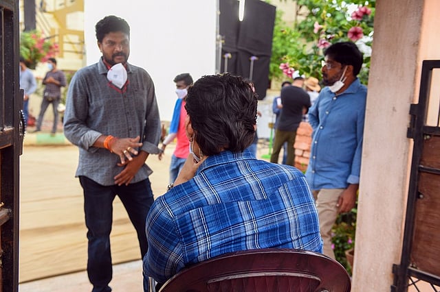 In the picture that was shared along with the tweet, Mahesh Babu's back can be seen while he interacts with the movie team. He is wearing a casual blue shirt and is seen sporting a mask.