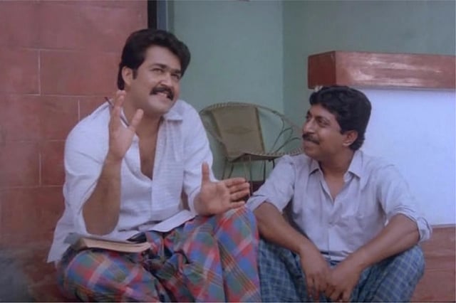Dasan (Mohanlal): Dasan, for all his buffoonery, is one of the most realistic representations of an unemployed middle-class Malayali youth. He comes with the paraphernalia of one—the false ego (not only does he think his job as a peon is below his dignity, he also dislikes being ordered around; he is a sore worker), the frustrations and the fuss about making a quick buck.