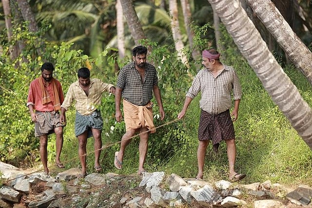 The tone of the film is set in the introduction of this group of masons who soon become a dear lot that the viewer sides with. Biju Menon plays Suni, an important member of the gang. And with him are his uncle, played by Alencier, a Gulf aspirant (Dinesh Prabhakar), a mostly-drunk Thamara, and a migrant worker Shanavas. The jokes come easy – a man who lives near their work site comes to complain that a worker sang the film song ‘Malare’ from Premam to his teenage daughter, and each worker is made to sing the song to identify who the unseen ‘poovalan’ was.