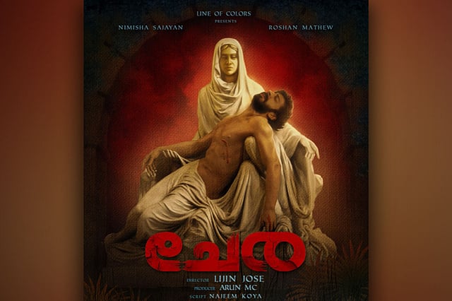 The dark poster reveals that Nimisha Sajayan and Roshan Mathew will be playing the lead roles in the film. Perhaps the mention of Roshan makes the Jesus in the picture look like him – a head of thick hair, a bearded face and a thin body. Under the red letters of the film title are more names, revealing that Chera is produced by Arun MC, and the script comes from Najeen Koya. The cinematography is by Alex J Pulickal and music by Shahabaz Aman.