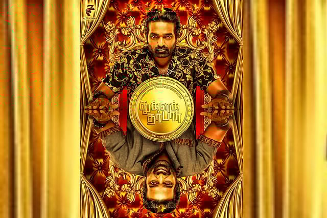 The poster shows Vijay Sethupathi seated on a table and a huge golden coin placed in front of him bearing the film’s title. In the reflected image, Vijay Sethupathi sports a grin while he has a straight face in the other. As miniature golden birds flutter above his head, the poster gives the feeling that the film may have elements of comedy and fantasy.