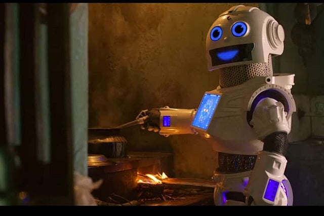 It shows Suraj Venjaramoodu and Soubin Shahir play a father and son. Suraj with a balding head of greys and a beard plays the conventional man who doesn’t seem to like machines of any sort and Soubin plays the complaining son. You see a white robot enter their lives and Suraj’s character conversing with it. When the robot comments that in Japan if you like someone you express it, the old man says sarcastically, “here, we rape or set the person on fire.”