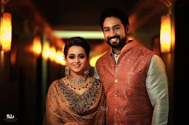 Bhavana looked radiant in a golden saree with tasteful temple jewelry at the wedding and wore a lehenga for the reception. The groom, Naveen, was dressed in a traditional mundu for the wedding and later wore a kurta and jacket for the reception.