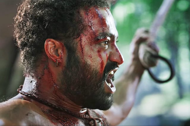 “Seas panic when they see him,” Ram Charan’s voice says, as Jr NTR’s character appears on screen, As water washes over his feet, he picks up an arrow and shoots it perfectly to hit a burning target at a distance. “Empires shake when he stands up,” the narrator says, as we see Bheem chained, followed by British authorities running around amid chaos.
