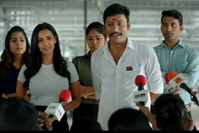 There are plenty of EPS-OPS, Rajani-Kamal politics and jallikattu references in the movie, with Lalgudi Karuppiah Gandhi’s party symbol being a bull. The director has also attempted humour by recreating an old Ramarajan Matrix Fight sequence in the movie. He also hasn’t spared the media and has caricatured an English news channel chief throwing questions at his guest in his show ‘The Nation doesn’t want to know’ (We know who!).