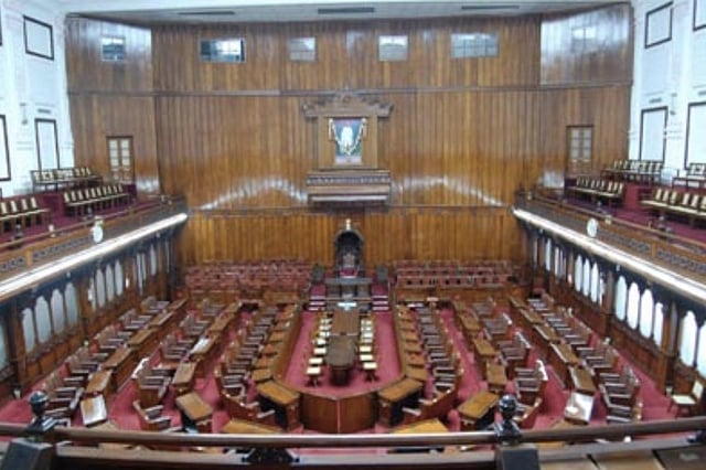 The members were staging a dharna, shouting slogans from the well of the House, demanding a debate on allegations of land-grabbing involving a Minister and a legislator. Raising the issue, while pressing for an adjournment motion to discuss it, Narayanaswamy said that a Minister and a legislator had allegedly grabbed land by creating fake documents in Bengaluru, and that a court in Bengaluru had taken cognizance of the case and had ordered criminal cases against them.