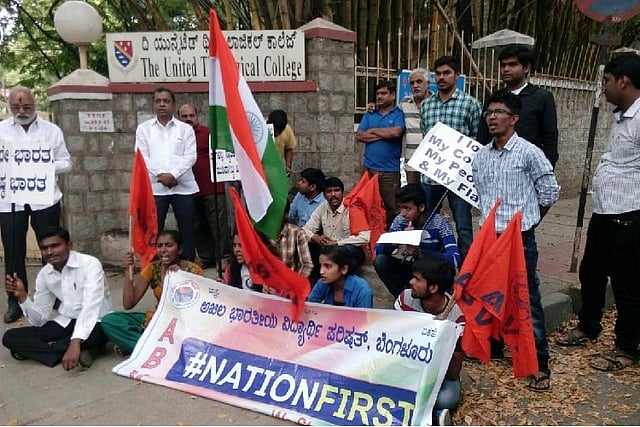 Akhila Bharath Vidyarathi Parishat (ABVP) is protesting outside the United Theological College in Bengaluru over an event organized by Amnesty International India to draw attention to alleged human rights’ violations in Kashmir.