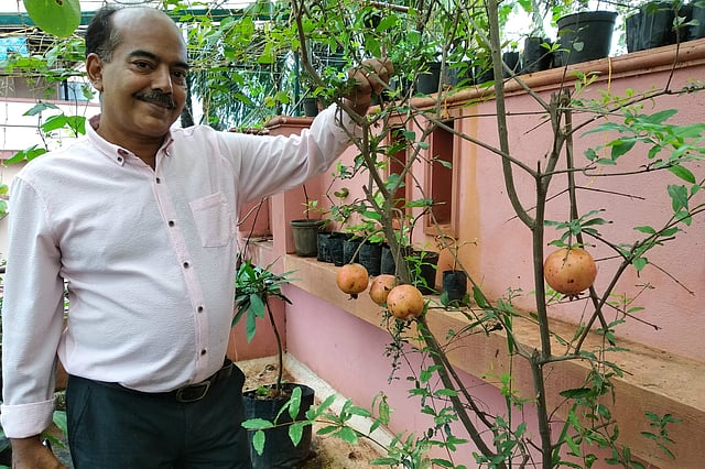 August 2018. The Southwest monsoon has taken a brief break, and Blany D’Souza is busy at work on his terrace garden, trimming the existing gourds and checking out the nursery, where new saplings are taking root. Just before the monsoon hit, the roof of his 1,200 sq ft terrace garden near Monkey Stand in Mangaluru was covered by ridge and snake gourd and vast vines of ivy gourd. The occasional bunch of grapes added variety to the shades of green. Huge brinjal had been left over to ripen for seed collection and exotic fruit varieties were all set to bloom and later fruit.