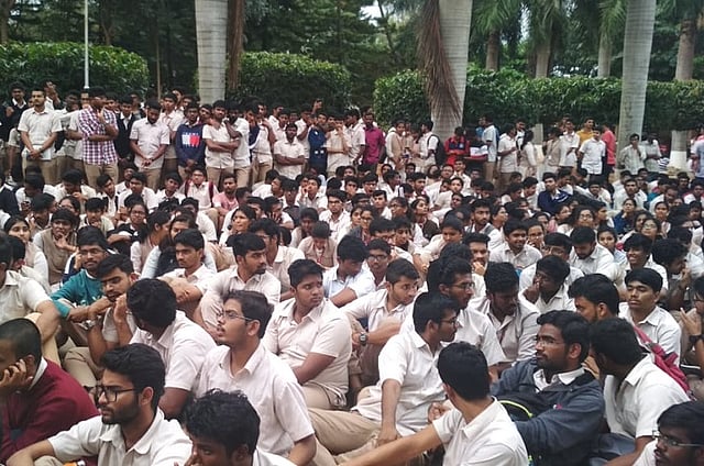 Angry students had assembled in protest, alleging that Harsha had killed himself on campus due to harassment by college authorities and they demanded justice for their friend. Some were seated on the cemented path leading to two buildings and some were standing surrounding the same area. There was a large number of police personnel inside the campus as well, even though the situation remained largely peaceful.