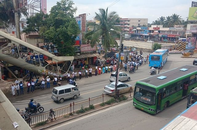 The BBMP, which began the excavation work for constructing the skywalk near Kalamandir, abandoned the work in May. The body maintains that the Bengaluru Metro Rail Corpoation Limited, which is constructing the metro in the area, did not grant permission to construct the skywalk. When TNM contacted BMRCL, the officials said that the approval was granted in June 2018 and that the BBMP was yet to take up the work.