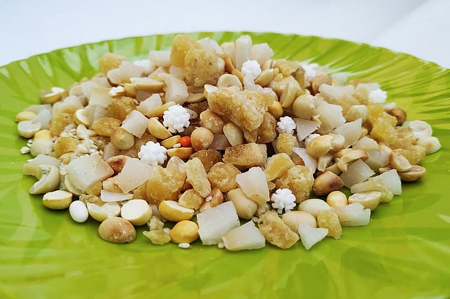 Avarekalu bath or Bisibelebath (blend of rice, lentils, vegetables and spices) are commonly prepared on the day too. The main course dishes are served with sides like Kosambari (salad with a tempering) or Mekke jola usli (steamed corn kernels coarsely ground into a paste and topped with tempering) while some Shenga hindi or Shenga pudi (powdered blend of spices, chillies and roasted peanuts) seals the deal.
