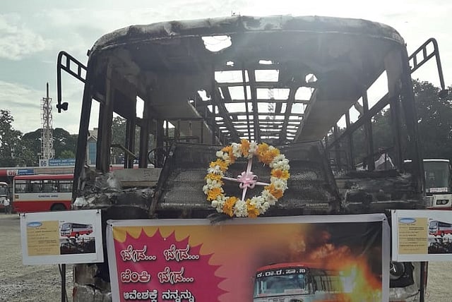 The Karnataka State Road Transport Corporation (KSRTC) bus was wrapped with banners providing information about its manufacture date, route, journey distance and its last date. One of the banners read “I belong to you and carry passengers every day. You need to protect me. Instead, you stone me, burn me… for what fault of mine.”