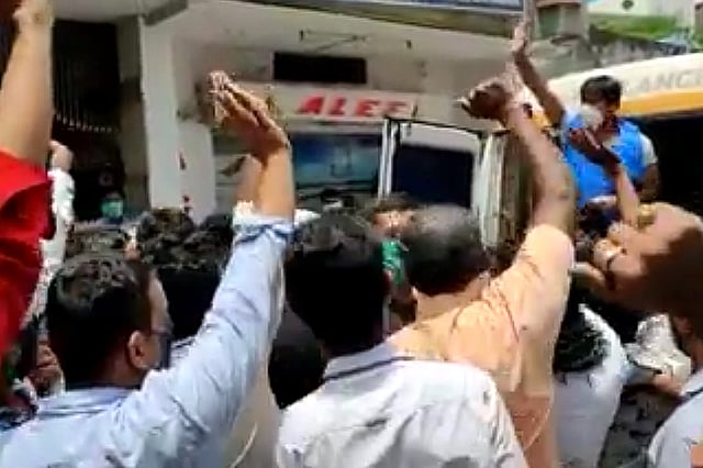 Imran Pasha, JD(S) corporator of Padarayanapura in Bengaluru, seen here greeting a crowd after testing positive for COVID-19. An FIR has been registered against him.