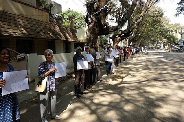 Protesting against the lack of footpaths and walking space on their roads, the residents of Sanjay Nagar in Bengaluru came out in large numbers on Sunday to form a human chain demanding their ‘right to walk.’