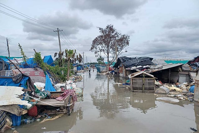 Those residing in these slums are mostly migrants from West Bengal, Assam and other northern states — many of whom work as rag pickers, domestic helps, or with app-based service providers. “A few days ago, we had woken up in the middle of the night to see that water had entered our huts. And it was rising quickly. There was no time to pack any of our belongings. We ran to the closest high-rise area and watched as our homes got flooded with water. All we could do was just stand there, shivering in rain,” says Khalil Mia, a resident of Munnekolala.