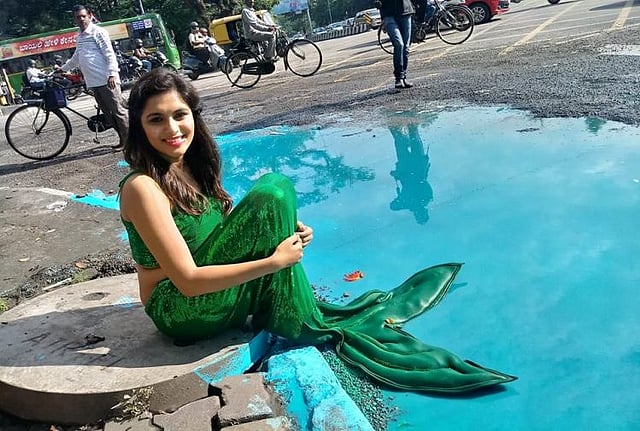 The mermaid is actor Sonu Gowda, who also posed as the princess when Baadal created the princess and the frog story in another pothole in Bengaluru last year.