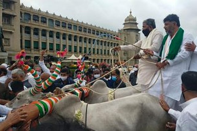 Led by its Karnataka state president DK Shivakumar and former Chief Minister Siddaramaiah, the Congress on Monday, held a bullock cart protest to raise the issue of high prices of fuel and cooking gas. Other senior leaders including former ministers like MB Patil too participated in the bullock cart rally to the Vidhana Soudha in Bengaluru on the first day of the Assembly session. This is also the first Assembly session for Basavaraj Bommai as the Chief Minister. The legislative session will be held for 10 days between September 13 and 24.