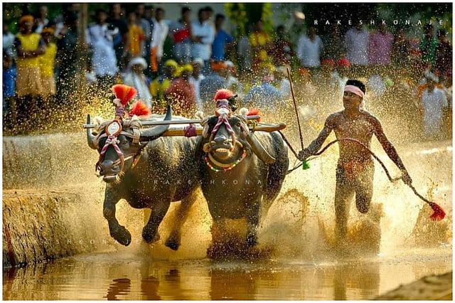 Kambala is a traditional slush-track buffalo race which is popular in the coastal districts of Karnataka. In these races, a pair of buffaloes tied to a plough run in parallel slush tracks, with a farmer controlling them.
