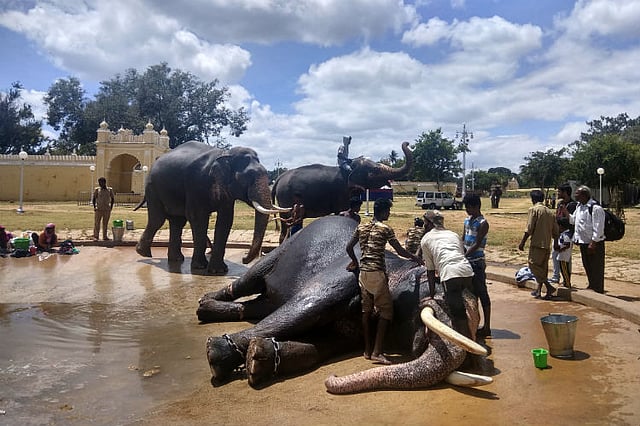 It is a hot day. The Chamundi hills glimmer in the distance, the sun is sharp, and the manicured gardens of Mysore Palace smell mildly of manure. The aanays eat grass and banyan leaves laid before them, slinging mud onto their heads with their long trunks. Dozens of visitors like us are here to see them. Dhananjaya, now 38 years old, is slated to replace Arjuna as the next elephant to carry the 'chinnada ambari' (a howdah of gold) which weighs over 750 kg.