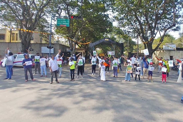 Residents living around Old Airport Road and Suranjan Das Road junction (the HAL junction) in Bengaluru, staged a protest on Sunday against the felling of trees. A total of 25 trees were to be cut according to the Bruhat Bengaluru Mahanagara Palike (BBMP), to pave the way for an underpass. Nearly 150-200 people from surrounding areas gathered and formed a human chain, around the junction, from 8 am onwards to mark their protest.