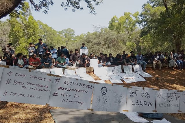 More than two weeks after protests were held in front of the headquarters of Ministry of Human Resource Development (MHRD) in Delhi, research scholars of IISc, Bengaluru held a hunger strike on Friday at the campus. A total of 300 research scholars registered for the protest and sat in front of the institute’s main building from 8am until evening chanting slogans and holding placards.