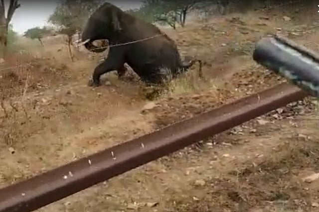 The video shows a visibly agitated elephant running towards a jeep, where men wearing forest department fatigues are seen in the car’s rearview mirror, laughing and firing a shot at the elephant. As the elephant nears the jeep, a person is heard shouting, “Hodi maga, hodi maga (hit son, hit).” A shot is fired at the elephant’s head, making it falter for a second and turn away. The elephant trumpets in panic and falls over on the bumpy ground, and the men are heard laughing as the jeep reverses away from the elephant.