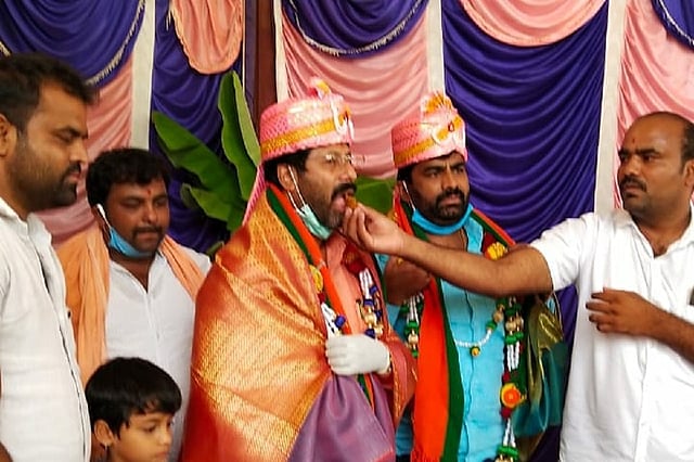Visuals from the event show Masala Jayaram was dressed for the occasion wearing a Mysuru pete and wrapped in a purple shawl, wearing white latex gloves. He cut a chocolate cake under a shamiana while others stood around the table, cheering and taking photographs. In visuals, people could be seen standing close to each other, taking photographs and feeding the MLA cake.