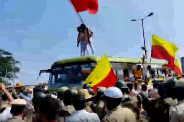 The protesters climbed on police vehicles with Kannada flags and raised slogans.
