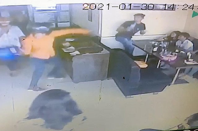 The 24-second long video clip shows a group of men barging into a restaurant and immediately starting to attack those seated around a table. In the group, two men wearing helmets start by throwing another helmet placed on a table near the door. The other men engaged in a fist fight, while throwing objects on the four people seated around a table. Two men in the group seated around the table retaliate and take the fight outside, while two women stare at the door.
