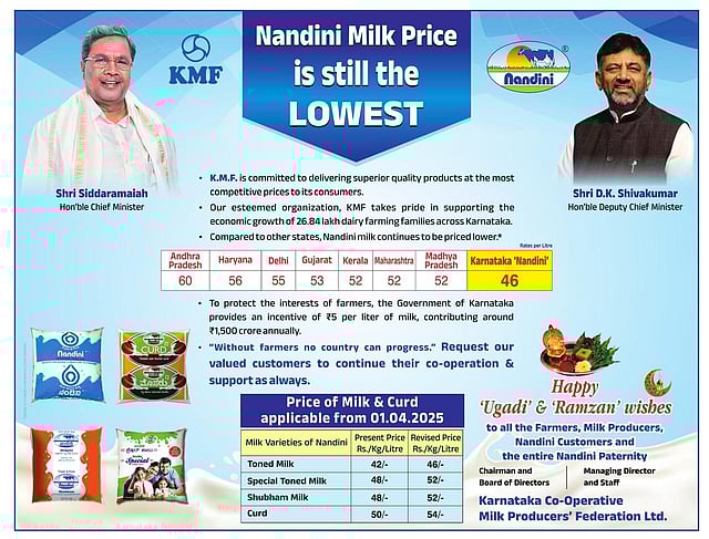 The Congress government in Karnataka appears to be in damage control mode after coming under fire for raising the prices of milk and curd. In an attempt to justify the hike, the government has placed advertisements in newspapers, claiming that Nandini dairy products remain the most affordable compared to several other states.