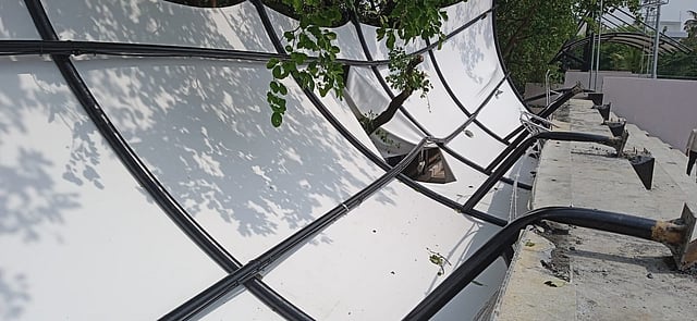 The stadium, located in Bengaluru’s HSR Layout, was inaugurated by Chief Minister Basavaraj Bommai on March 1. It was built at a cost of Rs 50 crore. Visuals of the stadium after the downpour on Sunday show the audience gallery’s covering, which consists of a curved sheet supported by metal rods, fallen to the side as the metal bases that held the rods in place were broken and bent over. The sheet was also torn in places where trees pierced it as the structure fell backwards.