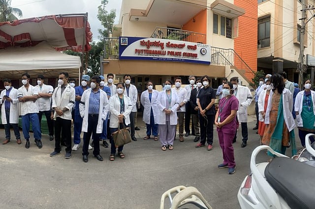 The staff of the Bannerghatta branch of Bengaluru’s Fortis Hospital staged a peaceful protest outside the city’s Puttenahalli police station on Monday, June 14, expressing their discontentment over assaults on frontline workers. The protest was sparked by an incident in the hospital Intensive Care Unit (ICU) on Saturday, June 12. Two medical professionals of the hospital were allegedly assaulted by the relatives of an ICU patient on ventilator support in the city on Saturday. Dr Padmakumar, a senior intensivist, and Mala, a nurse at Fortis Hospital, were threatened and abused by the patient’s son, Jagdeesh. Following the incident, the Private Hospitals and Nursing Homes Association (PHANA) has called for strict action to be taken against the accused.