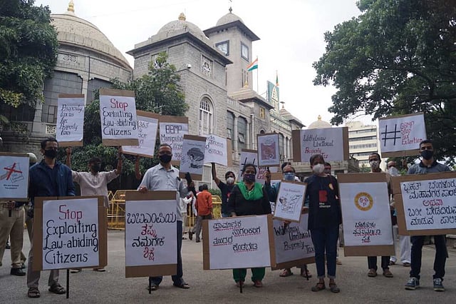 The Bengaluru Navanirmana Party on Saturday, September 4 protested outside the head office of the Bruhat Bengaluru Mahanagara Palike (BBMP) for serving notices and levying fines on property owners, stating that they have underpaid their property tax. The notices are based on a zonal reclassification that was carried out by the civic body in 2016. The residents alleged that the civic body did not consult or inform them about the move. While a group of people gathered outside the BBMP’s office, carrying placards and raising slogans, others took part virtually in the demonstration, to demand immediate resolution of the issue.