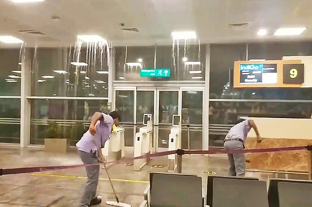 Staff at Kempegowda International Airport in Bengaluru responded quickly to a major leak that occurred on Thursday night after rainwater began seeping through the ceiling in one part of the airport. Staff were forced to cordon off the area and began clearing the water away.