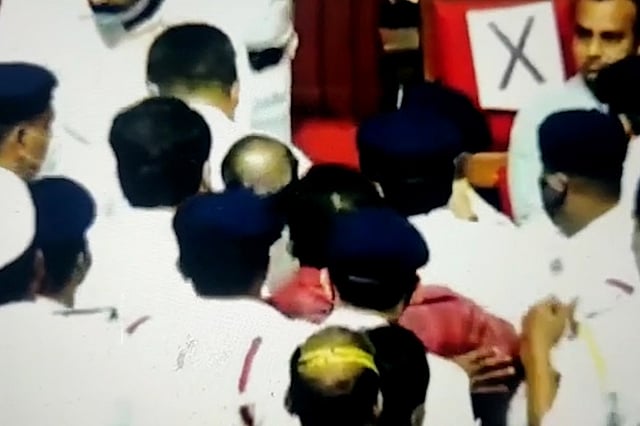 The drama began over a no-confidence motion against Chairman of the Legislative Council Prathap Chandra Shetty, who belongs to the Congress. Congress MLCs alleged that the Deputy Chairman forcibly occupied the chair after locking Prathap Chandra Shetty out. In the visuals, Congress MLCs Naseer Ahmed and Narayana Swamy are seen pulling the Deputy Chairman out of his chair. While Dharmegowda is seen resisting, BJP MLCs are seen pulling him back into the chair. Over a dozen marshals are visible, attempting to restore order and protect the Deputy Chairman.
