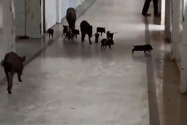 The video shows a group of pigs walking through the corridors of the district hospital as staff of the hospital can be seen in the same frame, going about their work as if there was nothing unusual.