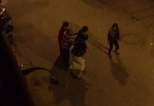 The man in the striped t-shirt claims to be a police officer, and shouts at Jerry to leave and pushes him. As Jerry and the friend start to walk away, the man in the white lungi runs up and starts hitting Jerry with a rod, and with his hands. He also repeatedly abuses Jerry.