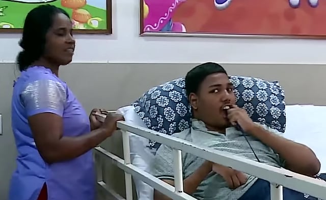 Ragini and Shafeeq live in a room on the fifth floor of the Al Azhar Medical College Hospital in Thodupuzha. The space has been lovingly decorated with colourful cartoons, toys, and textbooks, offering the teenager as much comfort as possible. Medical support is always on hand to assist with his needs.